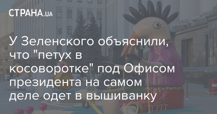 Удививший украинцев креативный петух в одежде, похожей на русскую косоворотку, который на днях появился на арт-объекте у стен Офиса президента одет все же в украинскую вышиванку.