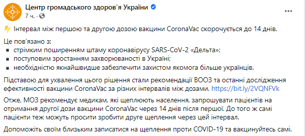 По данным Минздрава, основанием для сокращения интервала стали рекомендации Всемирной организации здравоохранения и крайние исследования вакцины от коронавируса компании CoronaVac.