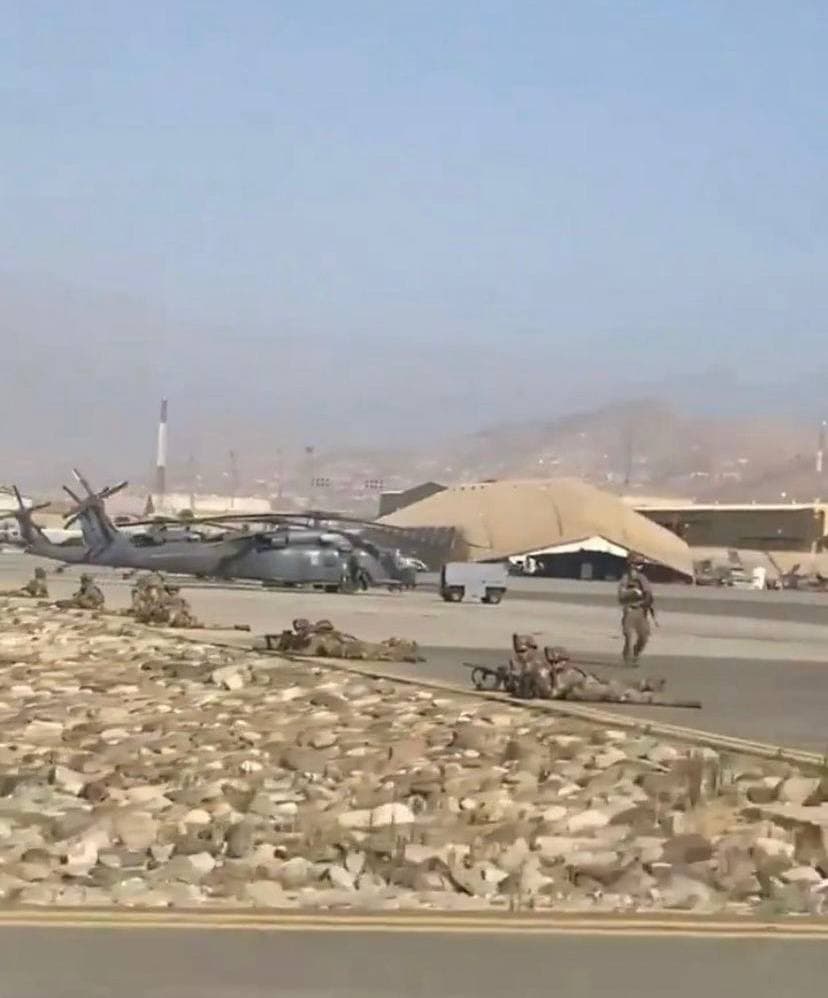 На других кадрах видно, как военный вертолет США отгоняет афганцев со взлетной полосы. Люди привязывают себя к американским военно-транспортным самолетам, лишь бы улететь. Видимо, это они и падают вниз на предыдущем видео.