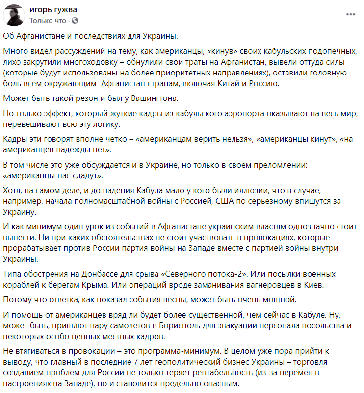 И как минимум один урок из событий в Афганистане украинским властям однозначно стоит вынести. Ни при каких обстоятельствах не стоит участвовать в провокациях, которые прорабатывает против России партия войны на Западе вместе с партией войны внутри Украины.