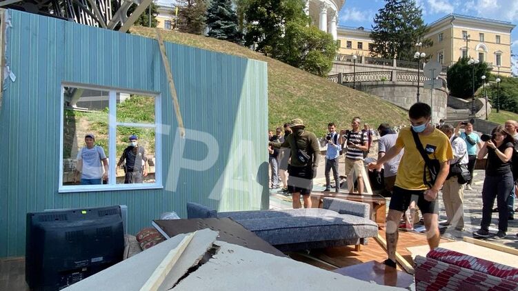 Сторонники "Нацкорпуса" разрушили часть инсталляции, посвященной быту украинцев в разные эпохи, которая вызвала скандал из-за стенда о советском периоде.