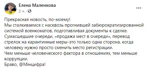 "Прекрасная новость, по-моему! Мы сталкиваемся с насквозь прогнившей забюрократизированной системой военкоматов, подготавливая документы к сделке. Сумасшедшие очереди, "продажа мест в очереди", перевод стрелок на карантинные меры - это только одна сторона, когда человеку нужно просто сменить место регистрации", - написала в Facebook гендиректор группы компаний "KDU Realty Group" Елена Маленкова.