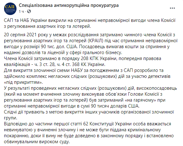 В пятницу, 20 августа, сотрудники САП и НАБ Украины произвели задержание члена Комиссии по регулированию азартных игр и лотерей во время получения взятки.