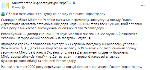 Вчера, 26 августа, Кабинет Министров Украины определил победителя конкурса на должность главы Государственного агентства автомобильных дорог Украины ("Укравтодора" - Ред.). Им стал Евгений Кузькин, который с мая 2021 года был врио председателя "Укравтодора".