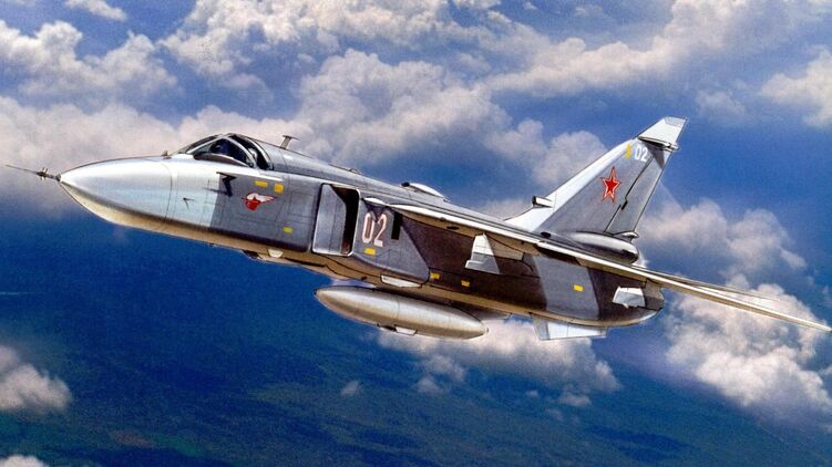 Советский сверхзвуковой бомбардировщик Су-24 с крылом изменяемой стреловидности производился в 1971-1993 годах. На его вооружении имеется шестиствольная пушка ГШ-6-23М, а также тысячи килограммов бомбовой и ракетной нагрузки.