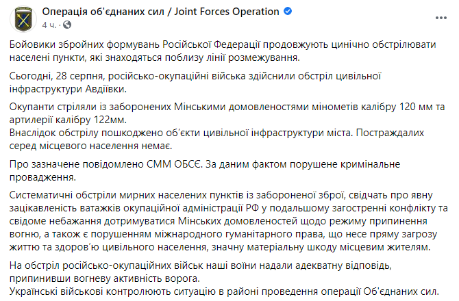 Там заявили, что по населенному пункту стреляли из минометов и 122-миллиметровых пушек. Разрушены гражданские объекты, но погибших или пострадавших нет среди мирного населения нет.