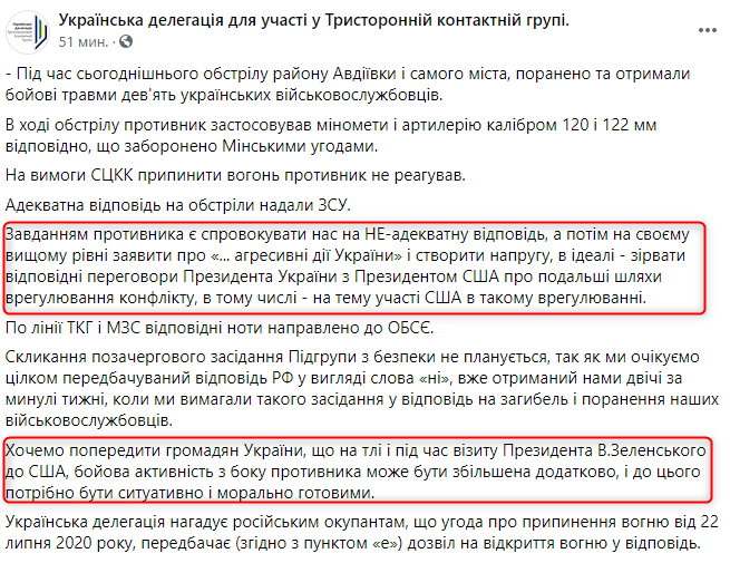 В украинской делегации ТКГ заявили, что это провокация перед визитом Зеленского к Байдену.