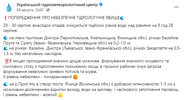 По данным синоптиков, 30 августа из-за ливней ожидается подъем воды в реках над уровнями, которые были по состоянию на 8:00 28 августа.