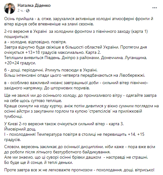 В Киеве 2 сентября также ожидается сильный ветер и вероятен дождь, предупреждает Диденко. Температура воздуха в столице не превысит +14-15 градусов.