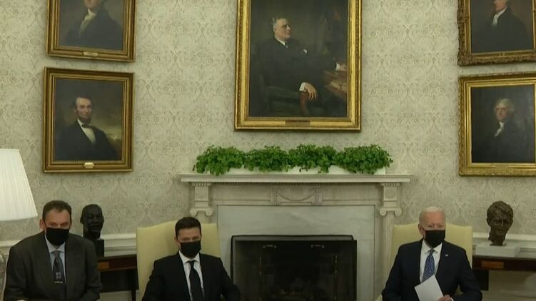 Появилась первая фотография со встречи Владимира Зеленского и Джо Байдена в Белом доме. На ней оба президента сидят в креслах в черных медицинских масках.