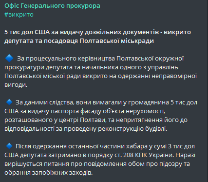 "5 тыс долл США за выдачу разрешительных документов - разоблачен депутат и чиновник Полтавского горсовета. В соответствии с процессуальным руководством Полтавской окружной прокуратуры, депутат и начальник одного из управлений Полтавского городского совета разоблачены на получении неправомерной выгоды.