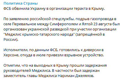 По заявлению российской спецслужбы августовский подрыв газопровода в Крыму был организован украинской разведкой при участии запрещённой в России организации "Меджлис крымско-татарского народа".
