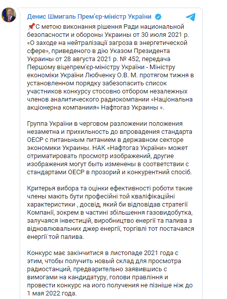 Премьер-министр Денис Шмыгаль поручил на протяжении недели объявить конкурс по отбору четырех независимых членов набсовета НАК "Нафтогаз Украины". Об этом глава правительства сообщил в своем телеграм-канале.