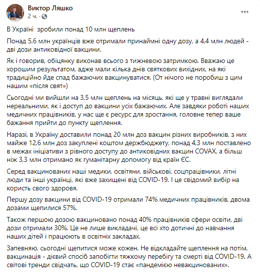 "Но благодаря работе наших медицинских работников, у нас еще есть ресурс для роста, главное теперь ваше желание прийти к пункту прививки", - написал Ляшко.