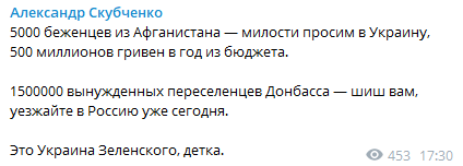 "5000 беженцев из Афганистана - милости просим в Украину, 500 миллионов гривен в год из бюджета. 1 500 000 вынужденных переселенцев Донбасса - шиш вам, уезжайте в Россию уже сегодня. Это Украина Зеленского, детка", - написал в своем телеграм-канале Александр Скубченко.