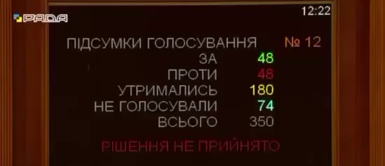 За документ проголосовали лишь 48 нардепов, против него - столько же народных избранников. Удержались 180 парламентариев, еще 74 - не голосовали вовсе.