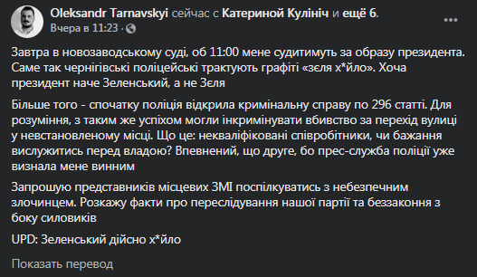 "Вешают мне 120 надписей "Зеля х@@ло", которые появились по городу Чернигову. И в постановлении эти надписи поясняются как оскорбление президента... Но я, во-первых, не вижу оскорбления президента, потому что там написано "Зеля", ну и "х@@ло" там написано через звездочку, там даже этого нет слова полностью", - сказал Тарановский в комментарии "Буквам".
