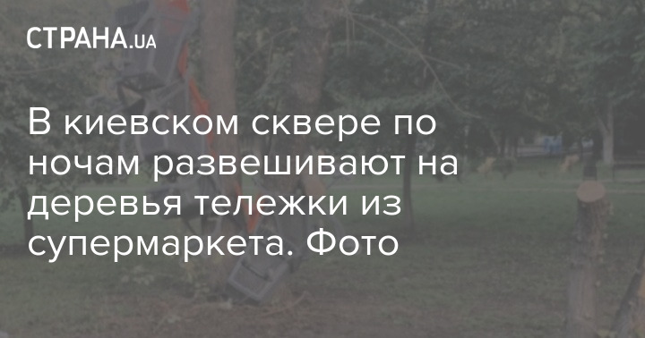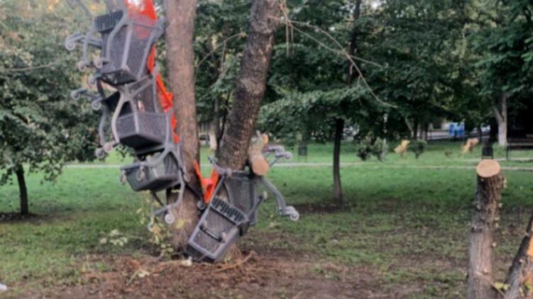 В киевском сквере по ночам развешивают на деревья тележки из супермаркета. Фото