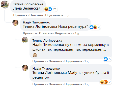 "Новая рецептура?", "Лена Зеленская", "ну она же за кормежку в школах так переживает, так переживает...", "Наверное, супчик был по её рецепту", - не унимаются родители.