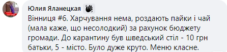 Например, в винницкой школе № 6 питания нет. "Раздают пайки и чай (малая говорит, что несладкий) за счет городского бюджета. До карантина был шведский стол - 10 грн родители, 5  - город. Было очень круто", - написала Юлия Яланецкая.