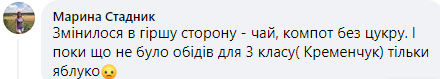"Изменилось в худшую сторону чай, компот без сахара. И пока что не было обедов для 3 класса (Кременчук), только яблоко", - написала Марина Стадник, ребенок которой учится в школе №1.