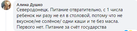"Северодонецк. Питание отвратительное, с 1 числа ребенок ни разу не ел в столовой, потому что не вкусное/не соленое/одни каши и те без масла, первого нет. Питание за счет государства", - поделилась комментарием Алина Душко.
