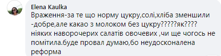 "Впечатление - за то, что норму сахара, соли, хлеба уменьшили - хорошо, но какао с молоком без сахара? как? никаких навороченных салатов овощных или еще чего, не заметила. Будет провал, думаю, потому что несовершенная реформа", - пишет Елена Каулка.