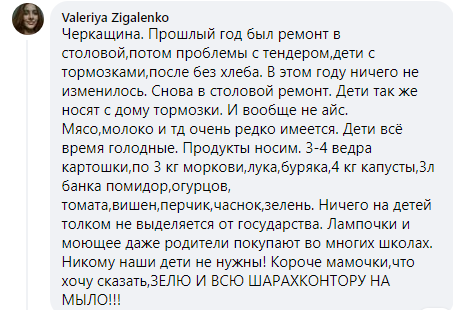 "Прошлый год был ремонт в столовой, потом проблемы с тендером, дети с тормозками, после без хлеба. В этом году ничего не изменилось. Снова в столовой ремонт. Дети также носят из дому тормозки. И вообще не айс. Мясо, молоко и т.д. очень редко имеются. Дети всё время голодные. Продукты носим. 3-4 ведра картошки, по 3 кг моркови, лука, буряка, 4 кг капусты, 3л банка помидор, огурцов, томата, вишен, перчик, чеснок, зелень. Ничего на детей толком не выделяется от государства..."