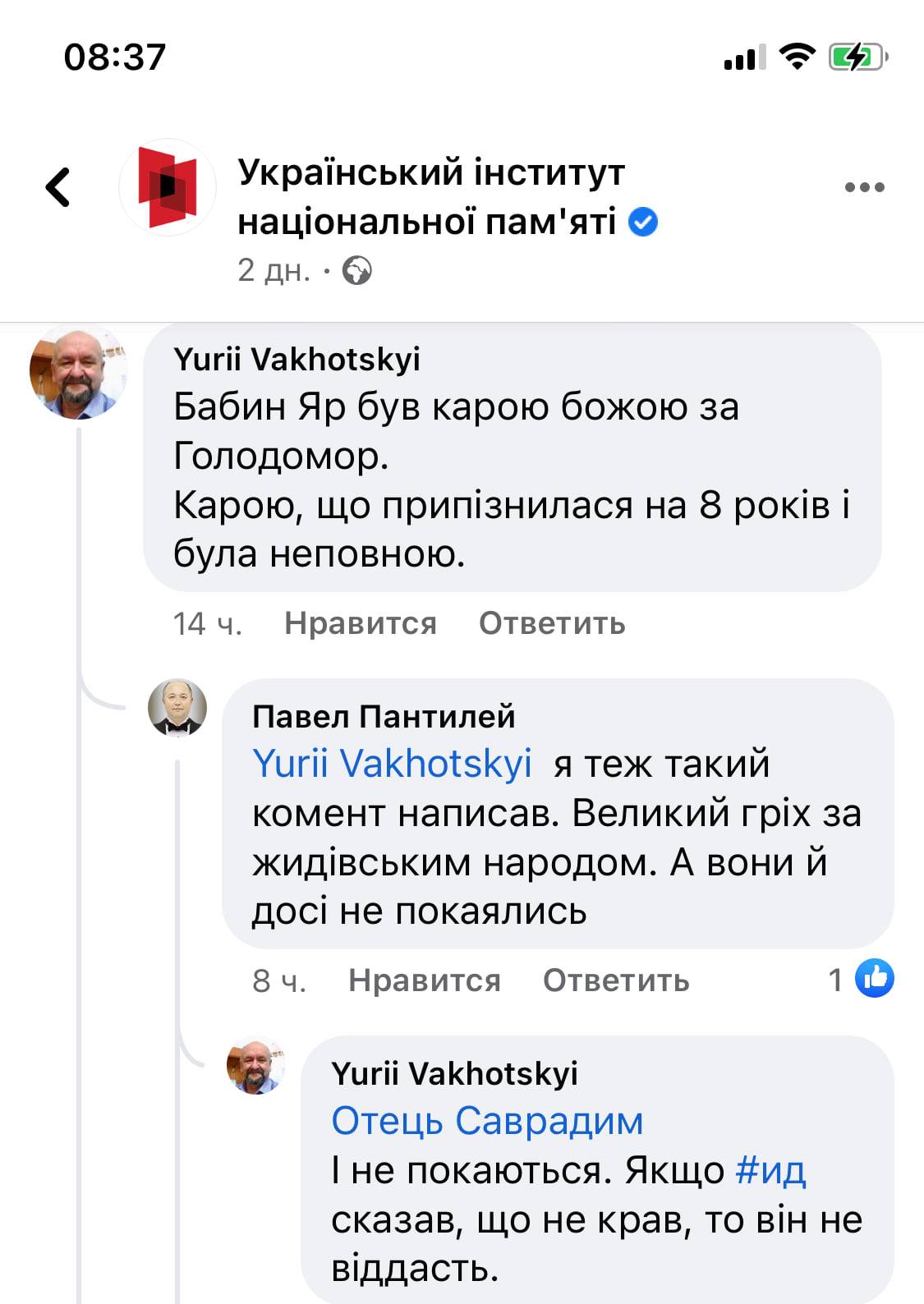 В Фейсбуке, в комментариях к одному из постов на странице Института Нацпамяти, Вахоцкий написал, что Бабий Яр - это "божья кара за Голодомор".