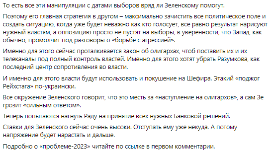 Говорят о досрочных выборах Рады. Но по своей воле Зе на них не пойдет, потому что в новом парламенте у него точно не будет монобольшинства и после них он фактически потеряет контроль над страной. Но не за полгода до выборов, а гораздо раньше.