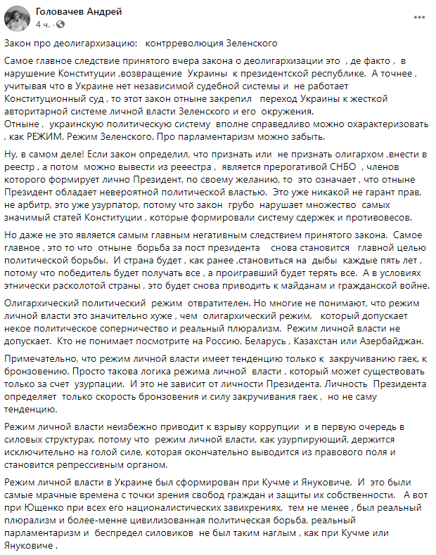 "Этот закон отныне закрепил переход Украины к жесткой авторитарной системе личной власти Зеленского и его окружения", - пишет Головачев. Но, по его мнению, даже не это является самым главным негативным следствием принятого закона.