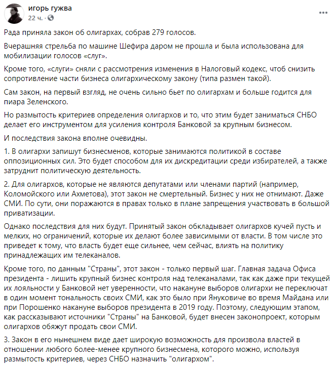"Итак, Верховная Рада все же решила перейти Рубикон и приняла "антиолигархический" закон, не дожидаясь выводов Венецианской комиссии. Украинский парламент вытер ноги о несколько статей Конституции и подарил главе государства инструментарий, при помощи которого можно, не заморачиваясь с процессуальными моментами, не обращаясь к судам, преследовать любого лидера оппозиции – а они практически все подпадают под предложенное определение "олигарха".