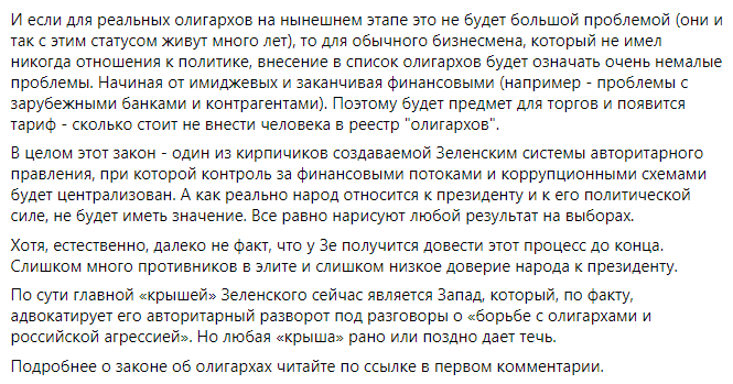 Сам закон, на первый взгляд, не очень сильно бьет по олигархам и больше годится для пиара Зеленского. Но размытость критериев определения олигархов и то, что этим будет заниматься СНБО делает его инструментом для усиления контроля Банковой за крупным бизнесом.