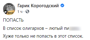"Попасть в список олигархов – лютый п@дец. Хуже только не попасть в этот список", пишет он.