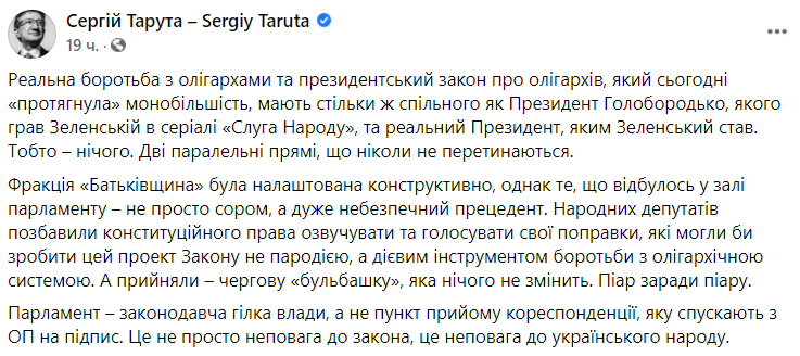 Депутат от "Батькивщины" и сам крупный бизнесмен Сергей Тарута тоже критикует закон об олигархах.