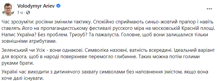 Он заявил, что "россияне сменили тактику" и теперь используют украинскую символику для продвижения идей "русского мира".