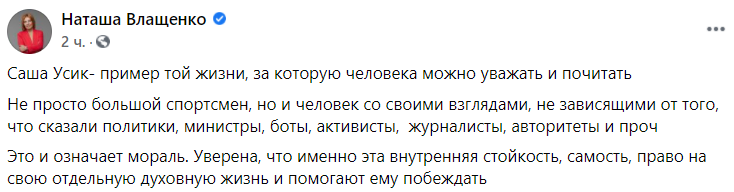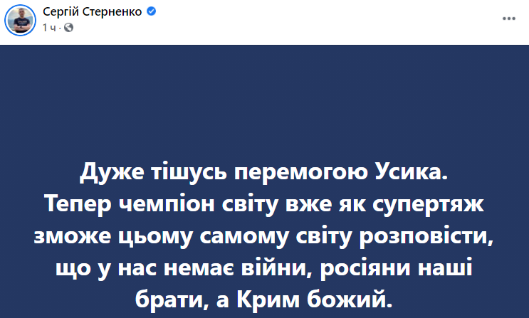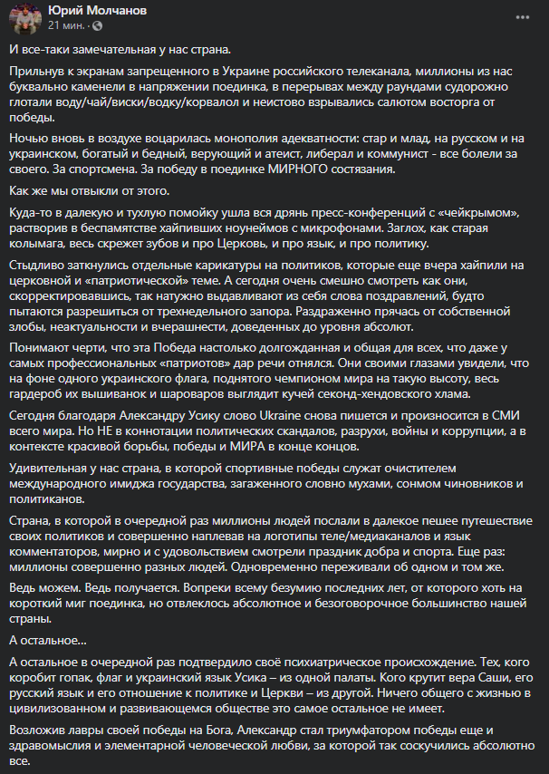 "Значение победы Александра Усика трудно переоценить. Это был бой не только за чемпионские титулы, но и поединок здорового украинского патриотизма с узколобым, лживым, самовлюблённым, трусливым, подлым и убогим украинским местечковым национализмом. И результат этого боя - не лишь спортивное достижение. Это ещё и победа над подменой понятий".