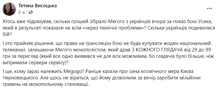 При этом массово продавал подписки на просмотр украинский интернет-сервис "Мегого" - только у него можно было посмотреть бой, заплатив 99 гривен. Однако число желающих было так велико, что приложения у многих пользователей просто зависали, и посмотреть бой люди не смогли. На что пошли массовые жалобы в соцсетях.