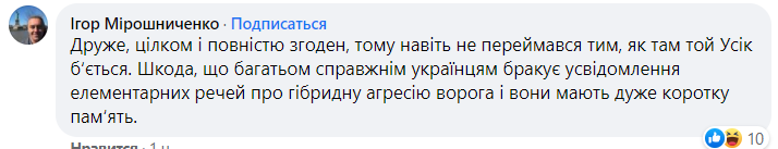 С Арьевым согласились его комментаторы-националисты. В частности, экс-нардеп от "Свободы" Игорь Мирошниченко написал, что "не парился о том, как Усик дерется". Потому что "настоящим украинцам не хватает осознания элементарных вещей о гибридной агрессии врага".