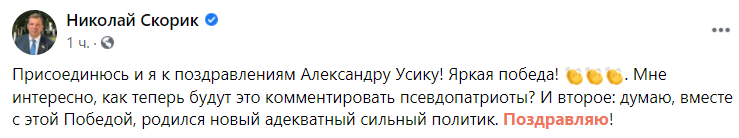 "Присоединюсь и я к поздравлениям Александру Усику! Яркая победа! Мне интересно, как теперь будут это комментировать псевдопатриоты? И второе: думаю, вместе с этой Победой, родился новый адекватный сильный политик. Поздравляю!" - написал в Facebook нардеп от ОПЗЖ Николай Скорик.