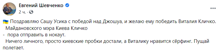 Нардеп Евгений Шевченко уже прочит Усика на место киевского мэра Кличко.