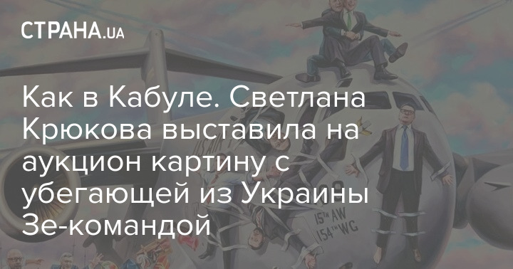 Заместитель главного редактора "Страны" Светлана Крюкова выставила на аукцион очередную картину, на которой вполне узнаваемые украинские политики бегут из страны, "оседлав" всеми возможными способами американский военный самолет. Таким образом автор проводит аналогию с недавними событиями в оставленном американцами Афганистане, когда многие пытались сбежать из страны, ухватившись за военно-транспортный самолет США.