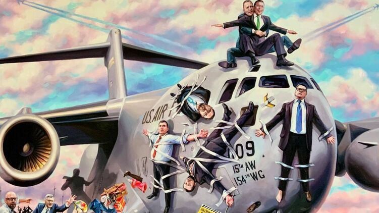 В частности, верхом на самолете прямо над кабиной пилотов расположились президент Украины Владимир Зеленский и глава его Офиса Андрей Ермак - они замерли на картине в культовой позе из фильма "Титаник". Прямо на носу самолета прикреплен изолентой глава СБУ Баканов.