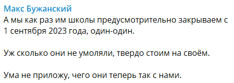 "А мы как раз им школы предусмотрительно закрываем с 1 сентября 2023 года, один-один.