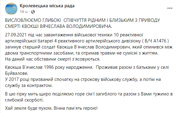 "27.09.2021 во время загрузки военной техники 10 реактивной артиллерийской батареи 4 реактивного артиллерийского дивизиона (В / Ч А1476) погиб старший солдат Квокша Вячеслав Владимирович, оказался между двумя транспортными средствами, и получил травмы не совместимые с жизнью", - говорится в сообщении горсовета.