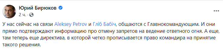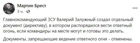 Среди волонтерской общественности это заявление вызвало большой интерес. И сегодня информацию Залужного начали подтверждать. По данным экс-замминистра обороны Юрия Бирюкова и волонтера Мартина Бреста, приказ, разрешающий передовой стрелять в ответ без согласования с тылом, ушел в войска.