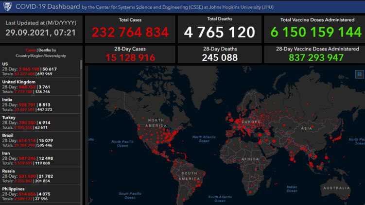 По данным на утро 29 сентября число зараженных на Земле приближается к 233 миллионам, фото arcgis.com