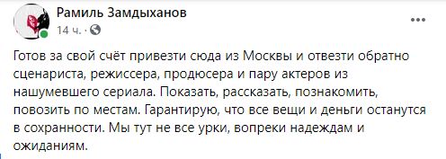 "Готов за свой счёт привезти сюда из Москвы и отвезти обратно сценариста, режиссера, продюсера и пару актеров из нашумевшего сериала. Показать, рассказать, познакомить, повозить по местам. Гарантирую, что все вещи и деньги останутся в сохранности. Мы тут не все урки, вопреки надеждам и ожиданиям" - написал донецкий журналист Рамиль Замдыханов.