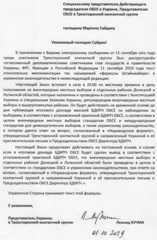 1 октября 2019 года стало известно, что Леонид Кучма - глава делегации Украины в Трехсторонней контактной группе - отправил представителю ОБСЕ Мартину Сайдику письмо. В нем он заявил, что Киев согласен с формулой Штайнмайера.