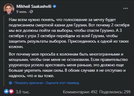 "После того, как избирательные участки будут закрыты, мы все должны в городах и селах выйти на улицы, чтобы защитить нашу достигнутую победу, поэтому я не могу остаться в стороне от этого процесса. Вечером 2 октября я буду в Тбилиси", - заявил Саакашвили.